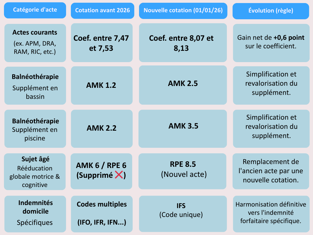 Dès le 1er janvier, la nomenclature évolue pour mieux valoriser les actes courants et la prise en charge spécifique. Voici le comparatif précis des coefficients intégrés dans votre logiciel VEGA :