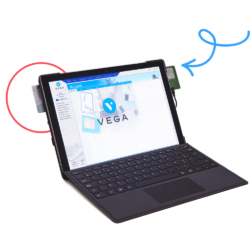 - Le nouveau pack VEGA Tab et sa cover vous permet également de lire l’ApCV : la caméra de la VEGA Tab permet de lire le QR-Code. Nous avons également intégré un lecteur NFC (= sans contact) dans la nouvelle cover