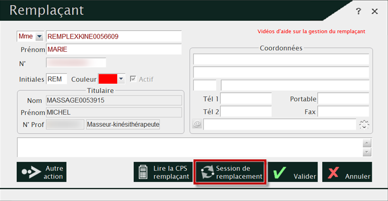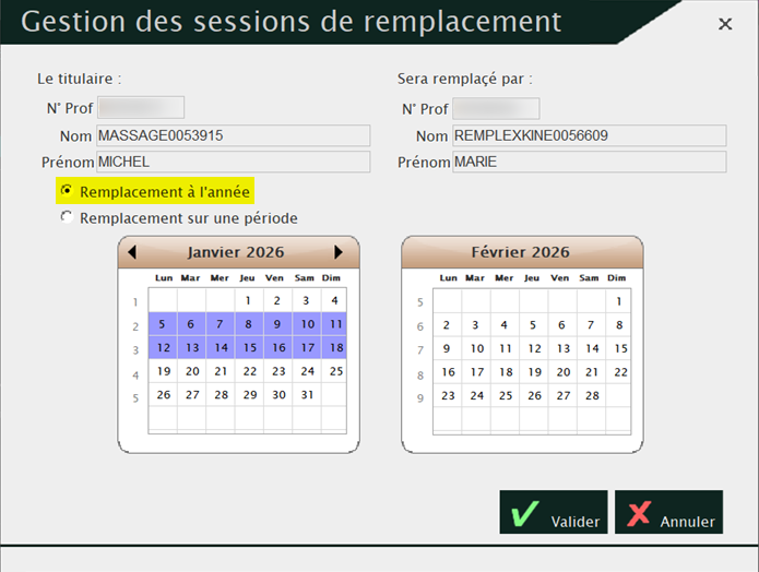 Si vous avez créé un remplaçant en choisissant l’option « Remplacement à l’année » vous devez renouveler sa session de remplacement. Sans ça il ne pourra plus facturer à partir du 1er Janvier.